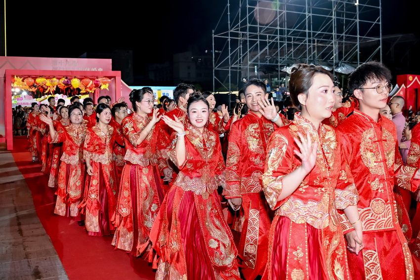 当晚,厦门五一广场热闹非凡。百对新人分别身着制式统一的秀禾服与马褂,朱红底色搭配着金线刺绣。他们整齐地站立在红地毯两侧,红地毯从入口一直延伸至主礼台。仪仗分列两旁、鼓乐齐鸣,新人们誓言铿锵有力,彼此携手奔赴美好未来。参加本届集体婚典的百对新人分别来自全国17个省,新人中有8位少数民族人士,还有2位外籍新人,他们是来自我市各行各业的优秀青年职工,分布于全市158家企事业单位。本科及以上学历者达80.2%,其中研究生及以上学历者有41名。